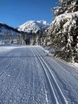 I tried to post this from the upper loop this morning, but my weak connection didn’t allow it. The upper loop was just heavenly this morning! Blue kick wax, perfect tracks, blue skies, silky looking skate track. The groomers will be back at it on Wednesday morning. Lower loop is also being groomed but has thin snow cover so watch for rocks and dirt in places.