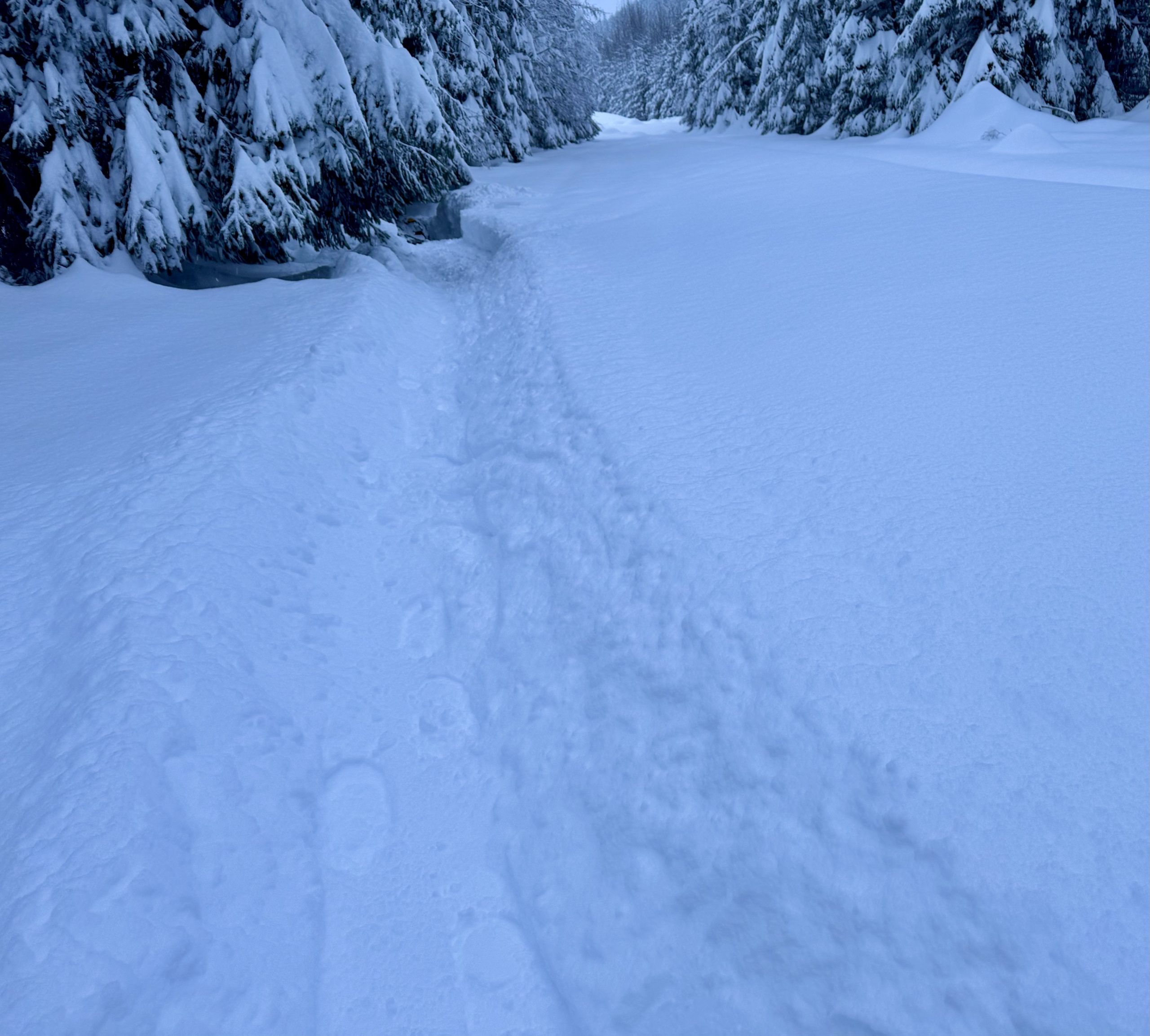 I think you can stop your snow dances now. With about 5’ of fresh powder this week things were extra hard today. Starting with a 7’ Highway berm preventing parking, then a huge dig-out of the equipment, then a floaty- wallowing but too-short attempt to run a few laps with only the Skandic. It’s only result was a drunken half-track at the end of which is a stuck snow machine.