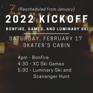 Come join us for our rescheduled 2022 Ski Season Kickoff, this Saturday from 4-6pm at Skater’s Cabin. The fire will be hot, the luminaries will be lit, and there will be ski games and a headlamp scavenger hunt for all. Bring a friend, bring your family, and bring a six foot bubble (and a mask for when you can’t). See you Saturday!