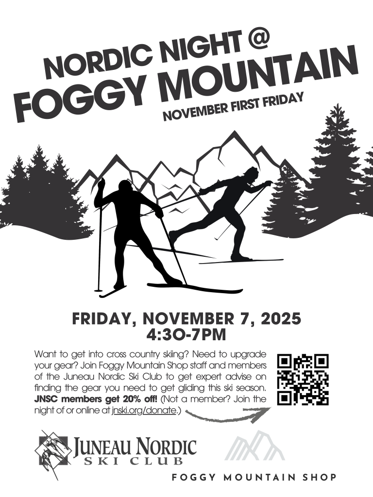 Looking for skis but unsure what to get? Need to offload some gear ready to pass on? Thanks to our community partners, we’ve got you covered! Stop by Foggy Mountain Shop during First Friday (November 7th) for Nordic Night. Foggy staff and JNSC members will be available answer questions and help guide you to the right ski purchase based on your ski ability and goals.Then, swing by our table at the annual Juneau Ski Sale at Centennial Hall Saturday morning (November 8th). Peruse used gear (and/or drop gear off to sell earlier in the week) and we’ll help answer questions like, “do these skis make my age look big?” See you this weekend!