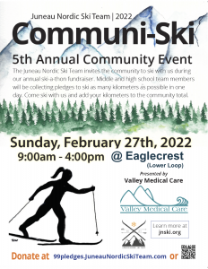 2022 Communi-Ski is almost here! Proudly presented by Valley Medical Care, this annual event is the Juneau Nordic Ski Team’s largest fundraiser of the season. Join them Sunday at the Eaglecrest Lower Loop to see how far we can collectively ski on the same trail in one day. Whether you contribute one or one hundred kilometers, every meter counts! Our goal is to surpass last year’s total of 2,500 kilometers skied and nearly $30,000 raised.