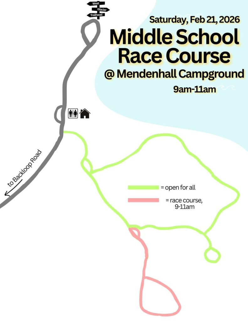 Saturday Ski Race, 9am-11amFeb 20, 2026 | Mendenhall CampgroundMiddle and elementary school skiers will be hosting sprint relays at the Campground Saturday morning. We’ll be occupying the “big lollipop” loop (see attached map). The rest of the Campground loop will be open to all. Thanks!